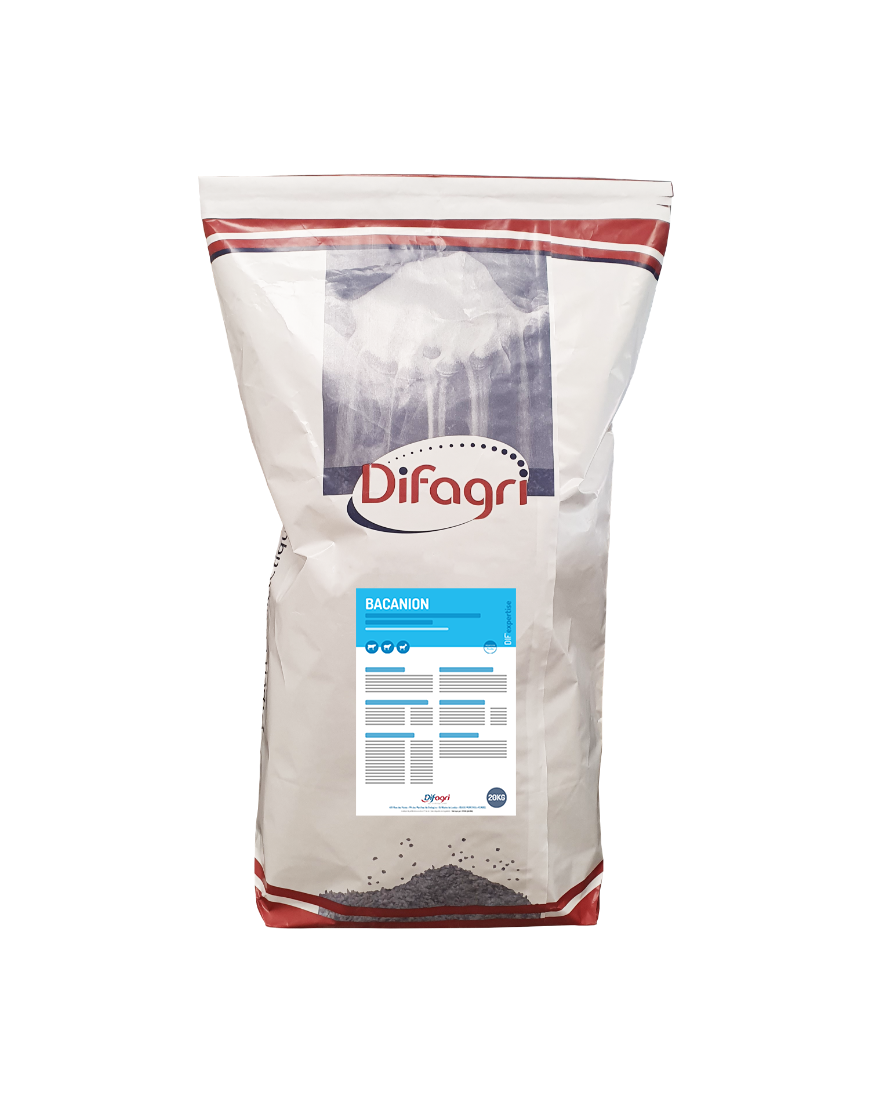 Synergie de plusieurs sels ioniques afin de faire baisser la BACA (Balance Alimentaire Cations Anions) afin de prévenir la fièvre de lait. Sa BACA est de -6600 mEq/kg. BACANION se complète d’un minéral apportant macro-éléments, oligo-éléments et vitamines. BACANION est formulé pour maximiser son appétence, ainsi qu’une présentation facile à distribuer et se conserve aisément.