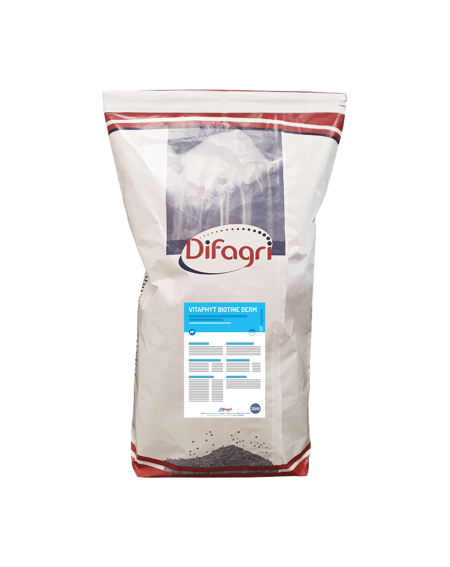 VITAPHYT BIOTINE DERM est constitué d’un noyau derm (curcuma, rudbeckie, saule blanc, boldo), de biotine et de zinc chélaté pour amener une réponse positive à la problématique liée aux boiteries en élevage en association avec les mesures d’hygiène.